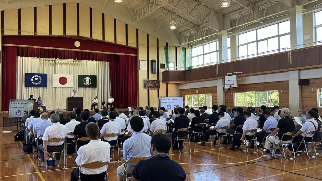 冒頭では、IDA代表理事・榎本幸太郎氏、東庄町副町長・向後秀樹氏、新明工業株式会社 代表取締役社長・近藤恭弘氏によるご挨拶のもと、本プロジェクトの背景や、ドローン社会実装における東庄町の先進的な取り組みについて紹介が行われました。続いて、東庄町で予定されている広域農地測量・物流支援・災害対応といった大規模ドローンプロジェクトの概要を説明し、今後の展開に対する期待が語られました。