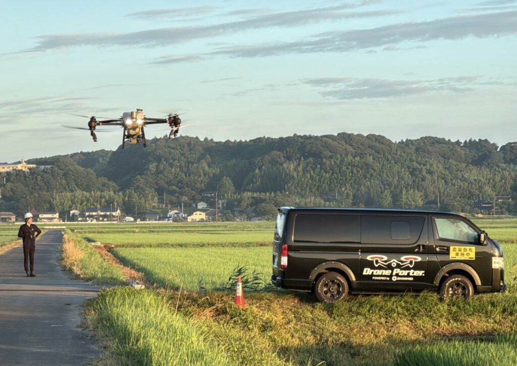 この大規模作業を支えたのが、IDAと新明工業株式会社が共同開発したドローン専用運用車両「アグリカルチャードローンポーター」です。この車両は「移動するドローン作業基地」として、広範囲かつ連続的な作業を可能にし、少人数体制での散布運用を現実のものとしました。